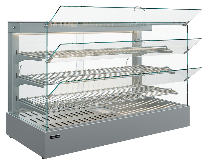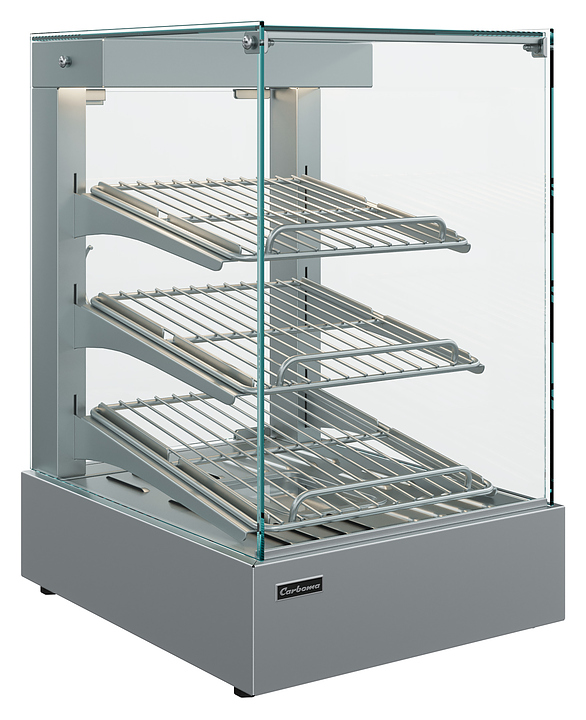 Тепловая витрина Carboma AC45 HWB 0,4-1 (self) серии Asia используется в небольших барах и кафе, на предприятиях общественного питания и торговли для поддержания в горячем состоянии, кратковременного хранения, демонстрации и продажи различных закусок и блюд, пиццы и выпечки. Модель оснащена системой пароувлажнения (типа мармит), задней распашной створкой, 3 полками-решетками с возможностью регулирования угла, термометром, термостатом и выдвижным поддоном для сбора крошек. Корпус и полки выполнены из нержавеющей стали. Особенности:
