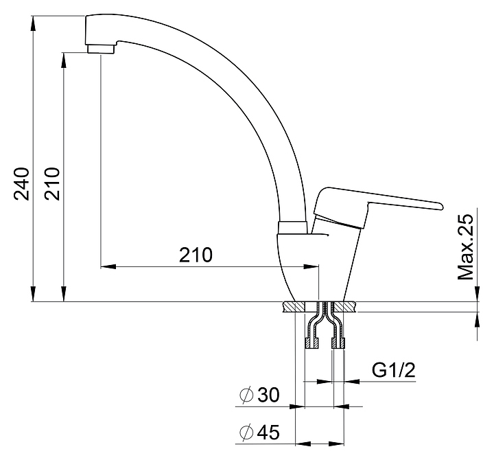 Смеситель Granula GR-2024 предназначен для использования на кухне для подачи горячей и холодной воды. Модель оснащена высоким поворотным изливом, керамическим картриджем, обеспечивающим плавный ход рычага смесителя, контроль и точность при выборе напора и температуры воды, а также аэратором для создания мягкой ровной струи без разбрызгивания. Однорычажный тип управления позволяет очень быстро и плавно регулировать подачу воды одной рукой. Изделие выполнено из высококачественной латуни, которая отличается прочностью, долговечностью и устойчивостью к перепадам температур. В комплект поставки входят гибкая подводка и комплект креплений. Особенности:
