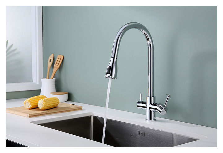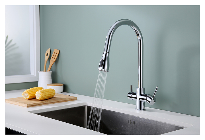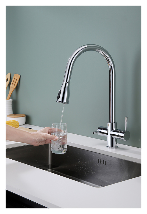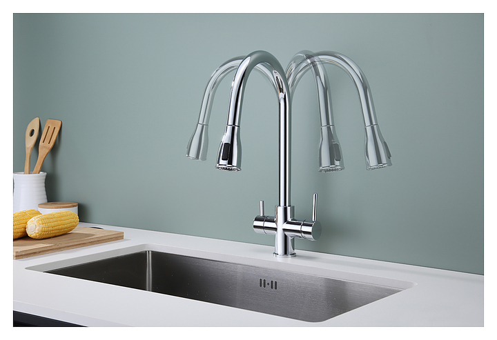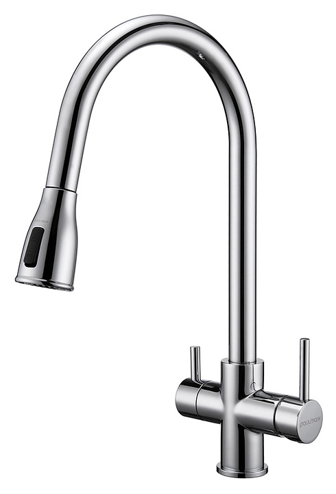 Смеситель Paulmark Lange La214212-CR предназначен для подачи горячей и холодной воды в кухонных помещениях. Вытяжной шланг облегчает процесс мойки посуды или продуктов любого размера и формы. Подключение фильтра для питьевой воды гарантирует, что питьевая и водопроводная вода не смешиваются. Изделие выполнено из латуни, отличающейся прочностью, долговечностью и устойчивостью к перепадам температур. В комплект поставки входят гибкая подводка из нержавеющей стали, усиленный комплект креплений и запасной аэратор. Дополнительные характеристики: