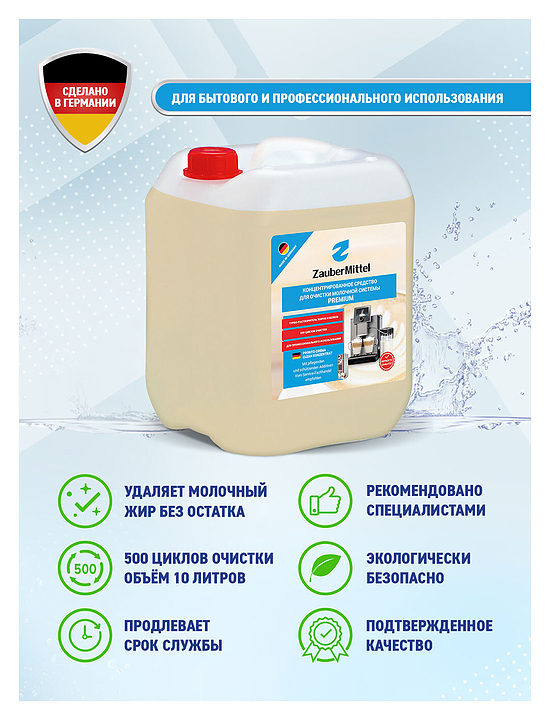 Жидкость ZauberMittel ZMP MC10 предназначена для всех автоматических кофемашин с функцией приготовления капучино для очистки капучинатора от накипи, жиров, молока, масел и известкового налета. Продукт полностью безопасен и совместим с пищевыми продуктами. Особенности: