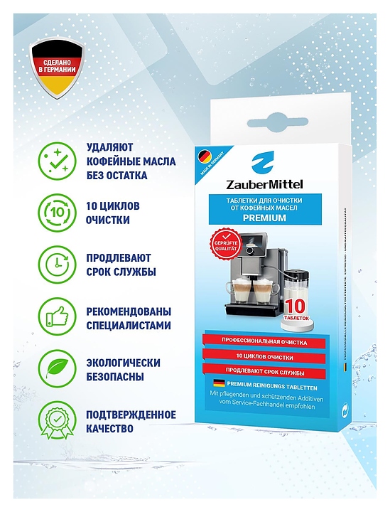 Таблетки ZauberMittel ZMP CT10 предназначены для очистки для всех типов автоматических кофемашин и кофеварок в частных домах и квартирах. Удаляют кофейные масла из портафильтров, заварочных групп и трубопроводов. Особенности: