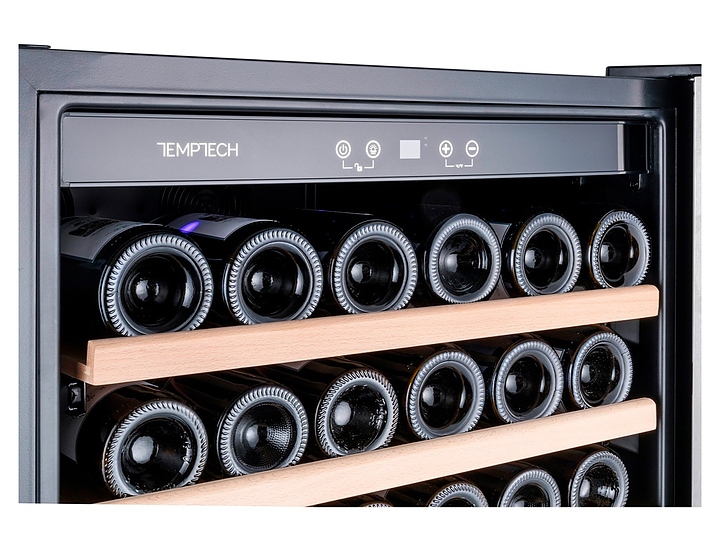 Винный шкаф Temptech Premium WP180SCS предназначен для охлаждения, хранения при оптимальных условиях и демонстрации бутилированного вина различных сортов в барах, ресторанах, специализированных магазинах, подсобных складских помещениях, а также домашних условиях. Модель оснащена монотемпературной холодильной камерой с 15 выдвижными полками, фронтальной цокольной решеткой, распашной дверью на перенавешиваемых петлях с длинной вертикальной рукояткой и прозрачным обзорным остеклением. Корпус выполнен из металла с антикоррозийным покрытием черного цвета, дверная рама – из нержавеющей стали, полки – из массива буковой древесины. Особенности: