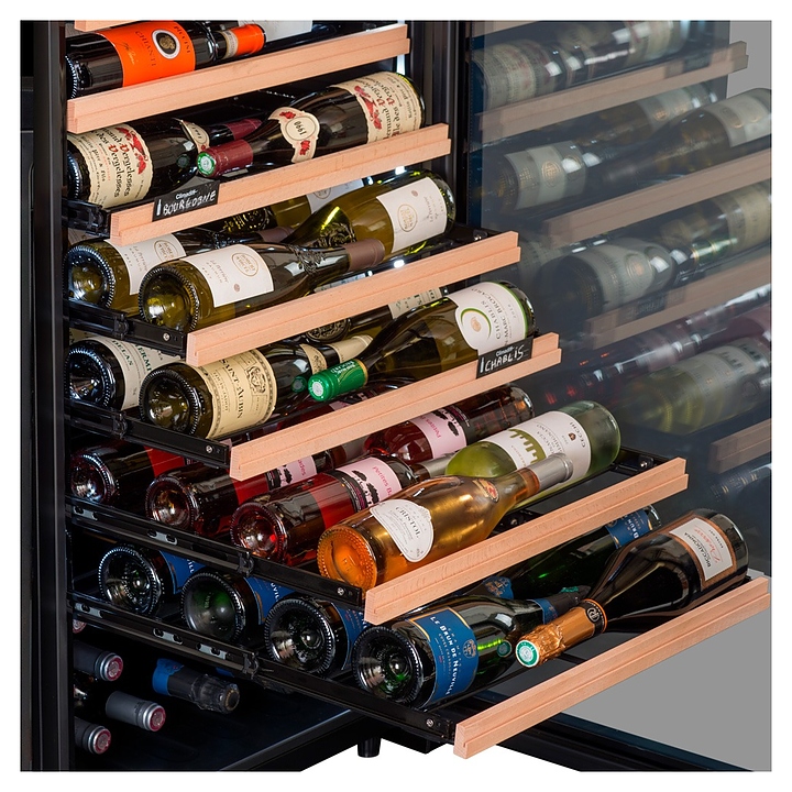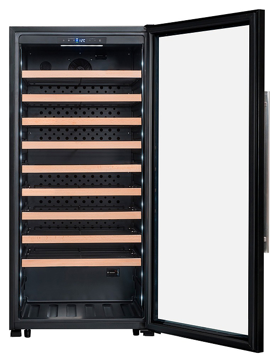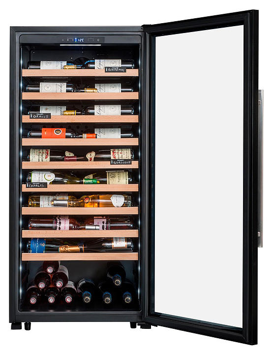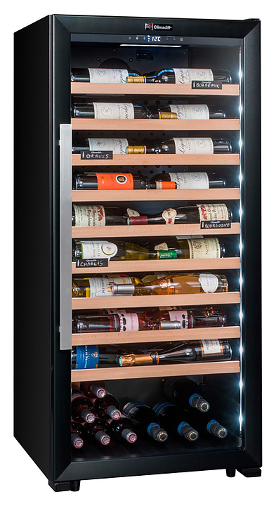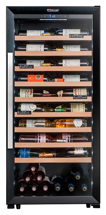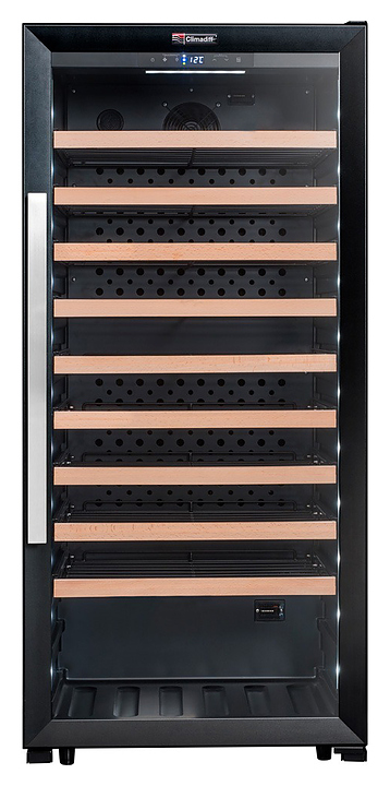 Винный шкаф Climadiff CPF100B1 предназначен для кратковременного хранения вина при определенном уровне влажности и температуры в ресторанах, специализированных магазинах, отелях, подсобных складских помещениях, в частных домах или квартирах и подготовки вина к подаче на стол. Модель оснащена сенсорным цифровым дисплеем, отключаемой внутренней подсветкой белого цвета и 2 транспортировояными роликами спереди, 2 регулируемыми по высоте ножками. Дверь выполнена из двойного закаленного стекла с защитой от УФ-лучей, полки - из натурального дерева с декором, ручка - из нержавеющей стали Особенности: