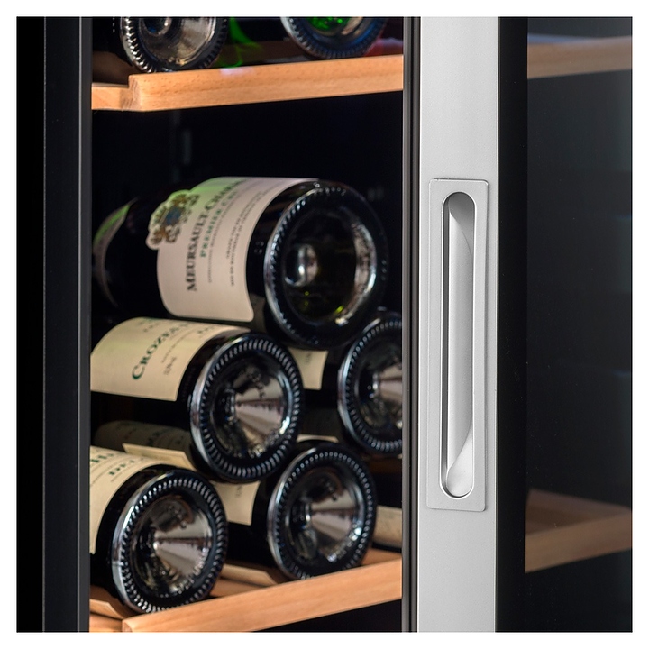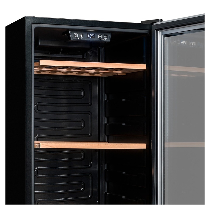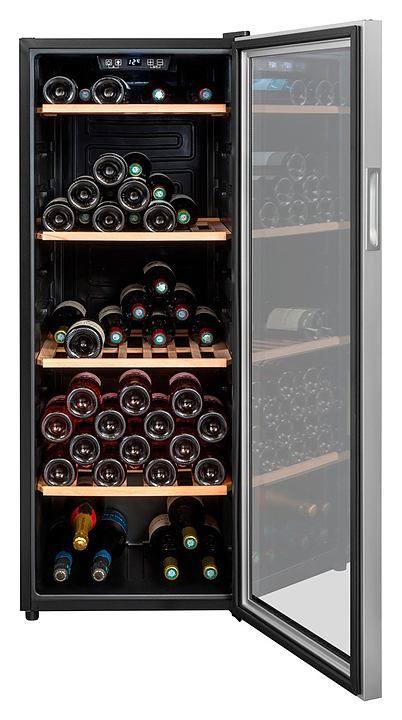 Винный шкаф Climadiff CS105B1 предназначен для кратковременного хранения вина при определенном уровне влажности и температуры в ресторанах, специализированных магазинах, отелях, подсобных складских помещениях, в частных домах или квартирах и подготовки вина к подаче на стол. Модель оснащена сенсорным цифровым дисплеем, отключаемой внутренней подсветкой, скрытой ручкой интегрированной в дверцу, 2 транспортировочными роликами сзади и 2 регулируемыми по высоте ножками спереди. Дверь выполнена из двойного закаленного стекла с защитой от УФ-лучей, рамка дверцы - из нержавеющей стали, полки - из бука. Особенности: