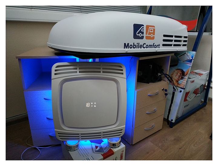 Автономный кондиционер MobileComfort MC2600 предназначен для создания комфортных климатических условий в кабине или салоне различного грузового транспорта: мобильных офисов и клиник, выездных лабораторий, спецтехники, автобусов, трамваев, катеров и яхт, а также автодомов и кемперов. Модель состоит из наружного блока и внутренней панели. Наружный блок имеет корпус обтекаемой формы с воздухозаборными отверстиями и защитной вентиляционной решеткой, внутренняя панель прямоугольной формы состоит из рамки с вентиляционными отверстиями и декоративной крышки с дисплеем индикации, пульт оснащен кнопочной клавиатурой и информативным дисплеем. Корпусы блоков выполнены из ударопрочного пластика белого цвета, дно корпуса наружного блока – из металла с антикоррозийным покрытием, корпус пульта и держатель – из пластика с серебристой поверхностью. В комплект поставки входят инфракрасный пульт дистанционного управления с настенным держателем и полный установочный набор: крепежная потолочная рамка, наборные по толщине крыши уплотнительные прокладки и комплект креплений. Особенности: