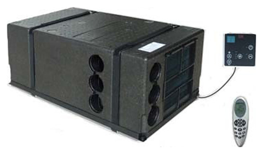 Автономный кондиционер MobileComfort MC3000U предназначен для создания комфортных климатических условий в салонах различного грузового транспорта: мобильных офисов и клиник, выездных лабораторий, спецтехники, катеров и яхт, а также автодомов и кемперов. Система терморегуляции состоит из компрессора, конденсатора, 4-ходового клапана, вентилятора и дополнительного нагревательного элемента, корпус прибора оснащен воздухозаборными и воздуховыводящими отверстиями, беспроводной пульт – кнопочной клавиатурой и информативным дисплеем, настенный пульт – инфракрасным приемником сигнала с беспроводного пульта, кнопочной клавиатурой и цифровым дисплеем. Корпус прибора выполнен из ударопрочного черного пластика с текстурной матовой поверхностью, основание корпуса прибора – из металла с антикоррозийным покрытием, корпус проводного пульта – из белого пластика с черным фронтом, корпус беспроводного пульта – из пластика с серебристой поверхностью. В комплект поставки входят беспроводной инфракрасный пульт дистанционного управления с настенным держателем, настенный проводной пульт дистанционного управления, патрубки слива конденсата, воздухозаборная решетка и набор напольных крепежных петель. Воздуховод и набор дефлекторов не входят в комплект поставки и заказываются отдельно. Особенности: