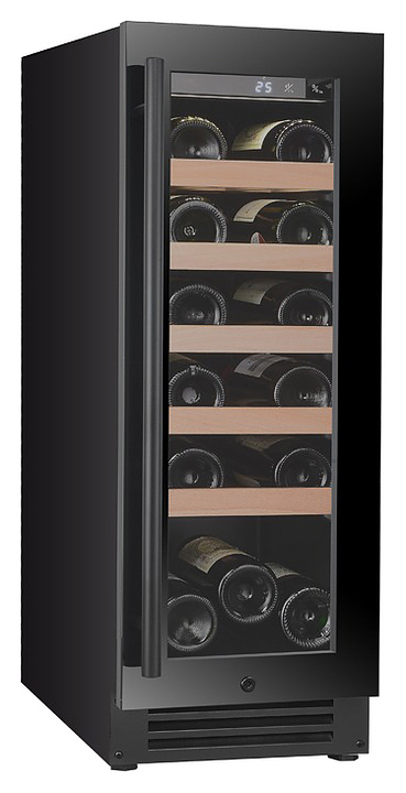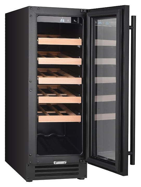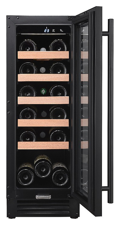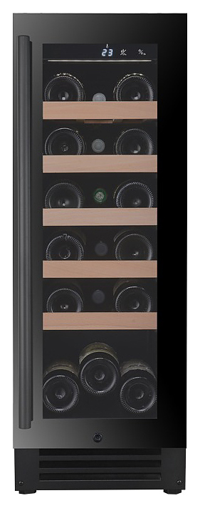 Винный шкаф MC Wine W20B предназначен для кратковременного хранения вина при определенном уровне влажности и температуры в ресторанах, специализированных магазинах, отелях, подсобных складских помещениях, в частных домах или квартирах и подготовки вина к подаче на стол. Модель оснащена сенсорным цифровым дисплеем с циферблатом и подсветкой голубого цвета, светодиодным индикатором температуры, белой светодиодной лентой и черной трубчатой ручкой. Дверь выполнена из двухслойного низкоэмиссионного стекла, рамка двери - из черного стекла, полки - из массива бука. Особенности: