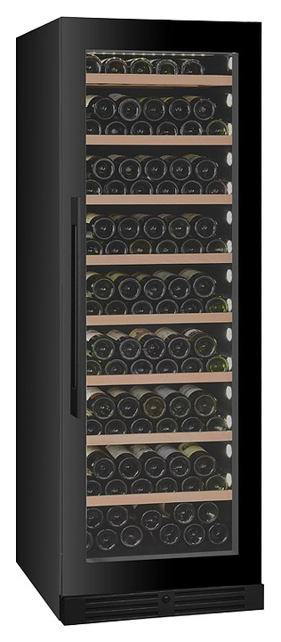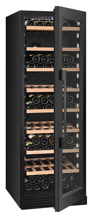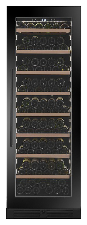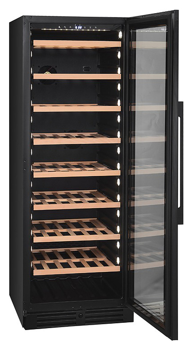 Винный шкаф MC Wine W180B предназначен для кратковременного хранения вина при определенном уровне влажности и температуры в ресторанах, специализированных магазинах, отелях, подсобных складских помещениях, в частных домах или квартирах и подготовки вина к подаче на стол. Модель оснащена сенсорным цифровым дисплеем с циферблатом и подсветкой голубого цвета, светодиодной подсветкой белого цвета, демонстрационным освещением по всей высоте шкафа, светодиодным индикатором температуры и черной трубчатой ручкой. Дверь выполнена из двухслойного низкоэмиссионного стекла с УФ-фильтром, рамка двери - из черного стекла, полки - из массива бука. Особенности: