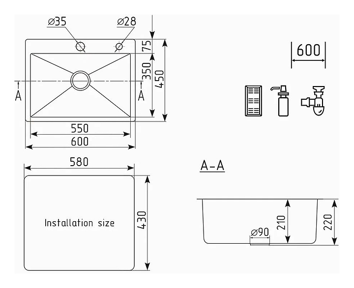 Мойка ULGRAN Steel US 600-001 предназначена для рационального планирования рабочего места на кухне. Модель оснащена широкой задней поверхностью для размещения смесителя. Изделие выполнено из брашированной нержавеющей стали, которая обеспечивает устойчивость к возникновению коррозии, механическую прочность, долговечность, защиту от налёта и потускнения. В комплект поставки входят сливная арматура, дозатор и коландер. Особенности: