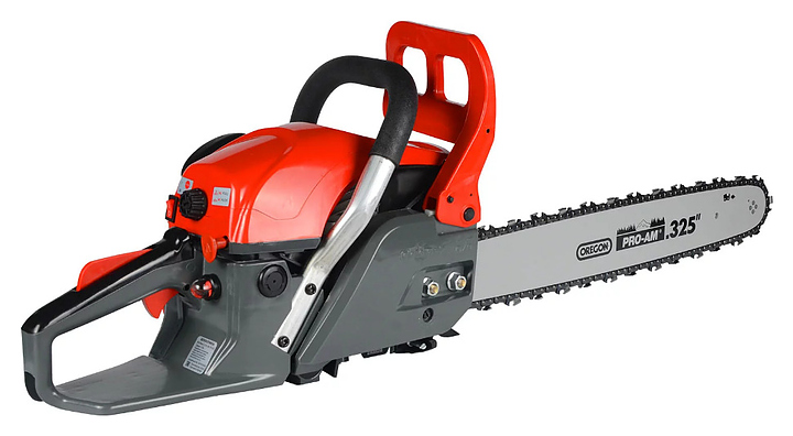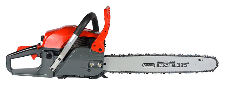 Бензиновая цепная пила EVOline CSG 46-18 ES предназначена для валки деревьев, раскряжевки древесных заготовок и обрезки сучьев. Модель оcнащена 2-тактным одноцилиндровым двигателем внутреннего сгорания, ручным стартером с вытяжным тросом и 2 транспортировочными рукоятками. Корпус, задняя рукоятка и фронтальный предохранительный щиток изготовлены из ударопрочного пластика в комбинации оранжевого и серого цветов, фронтальная рукоятка – из трубчатого металлического профиля с полимерной накладкой. Особенности: