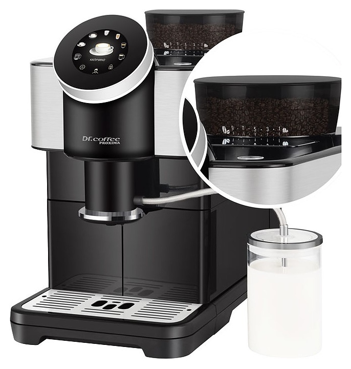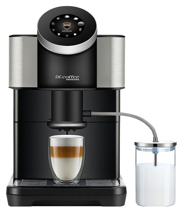 Кофемашина Dr.coffee Proxima H2 используется на предприятиях общественного питания и торговли для приготовления кофе и напитков на его основе. Модель оснащена инновационной системой вспенивания молока, русифицированным меню, интуитивно-понятным интерфейсом и сенсорным управлением. Корпус, контейнер для воды, несъемное заварное устройство и каплесборник выполнены из пластика, жернова – из керамики, трубка для подачи горячей воды - из металла. Комплектация:
