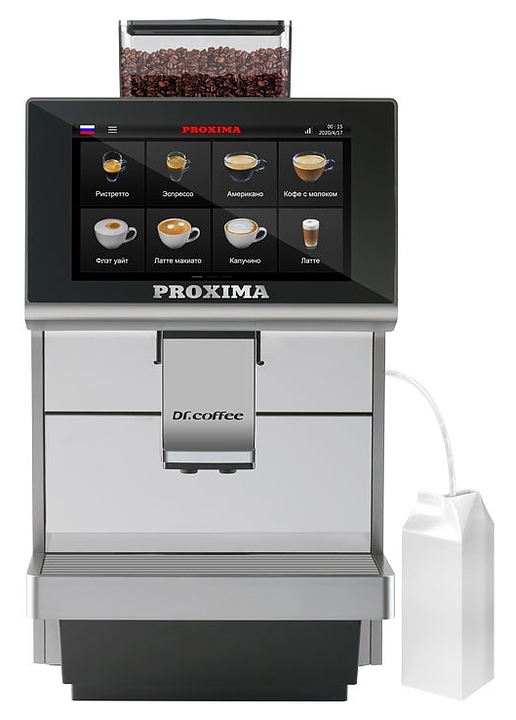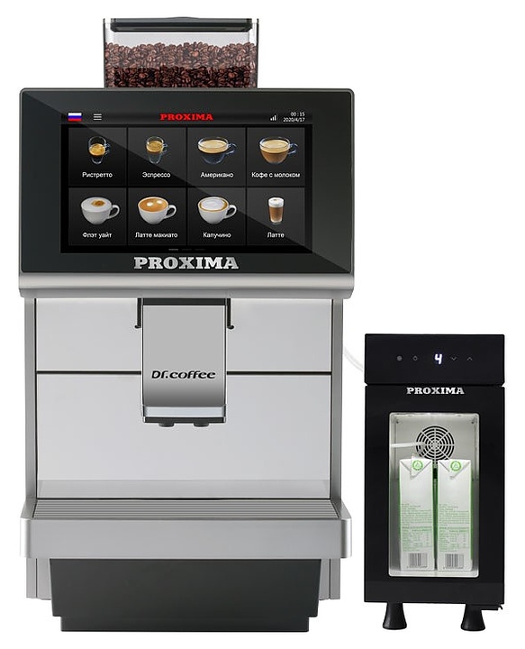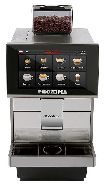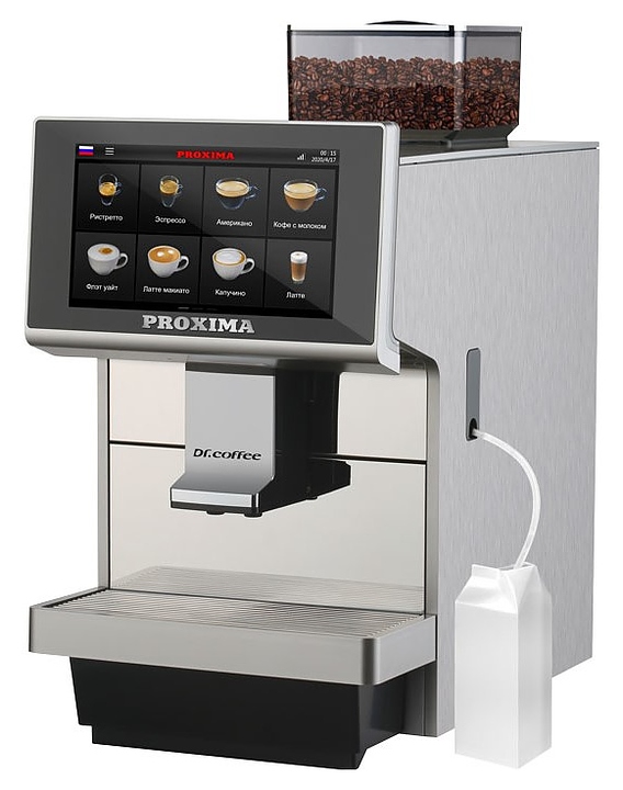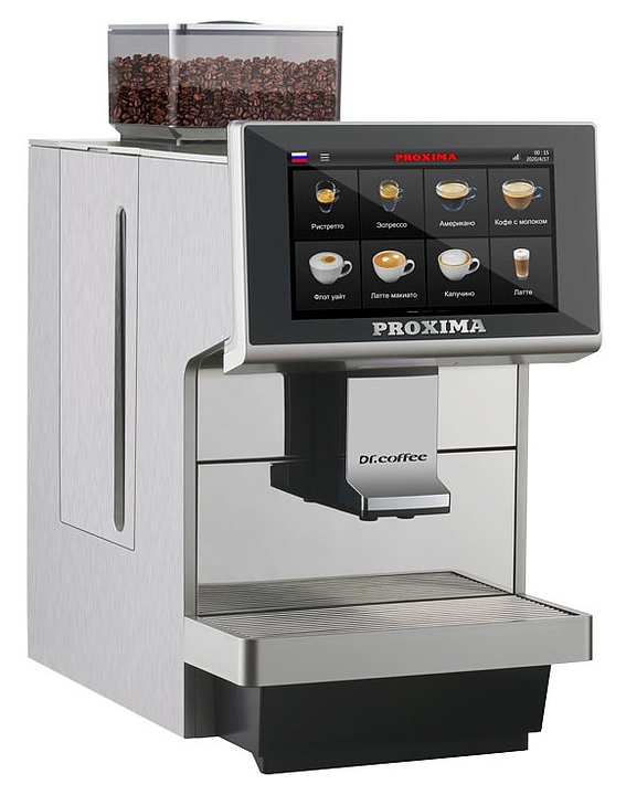 Кофемашина Dr.coffee Proxima М12 используется на предприятиях общественного питания и торговли для приготовления кофе и напитков на его основе. Модель оснащена сенсорной панелью с интуитивно понятным интерфейсом. Корпус, контейнер отработанного кофе, съемное заварное устройство, каплесборник и трубка подачи пара воды выполнены из пластика, жернова – из керамики, проточные бойлеры - из алюминия. Комплектация:
