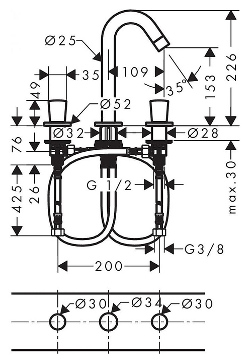 Смеситель для раковины Hansgrohe HG Logis 71133000 с донным клапаном, на 3 отверстия, хром