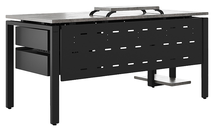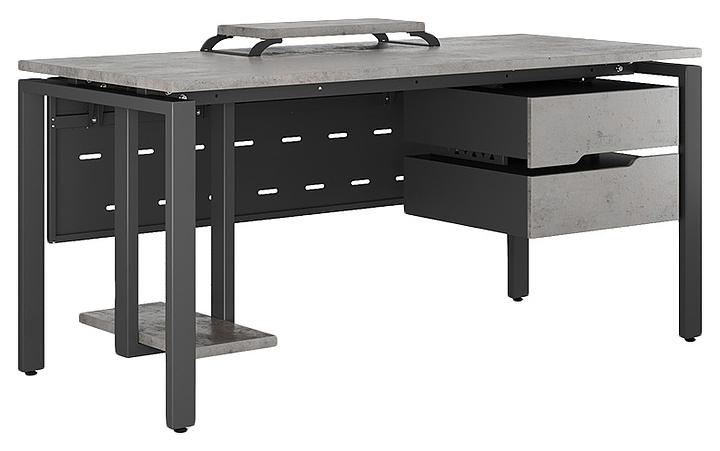Офисный стол Кобор P-80/60 black/chicago используется в офисных помещениях и кабинетах руководителей. Модель оснащена П-образными опорами. Каркас выполнен из металла, выкрашенного в цвет черный муар (RAL9005), столешница – из ламинированной древесно-стружечной плиты (ЛДСП) цвета бетон чикаго (F186 ST9). Опции (заказываются отдельно):