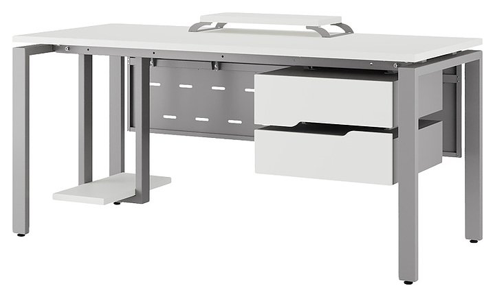 Офисный стол Кобор P-180/60 aluminum/premium используется в офисных помещениях и кабинетах руководителей. Модель оснащена П-образными опорами. Каркас выполнен из металла, выкрашенного в цвет алюминиевый металлик (RAL9006), столешница – из ламинированной древесно-стружечной плиты (ЛДСП) цвета белый премиум (W1000 ST9). Опции (заказываются отдельно):