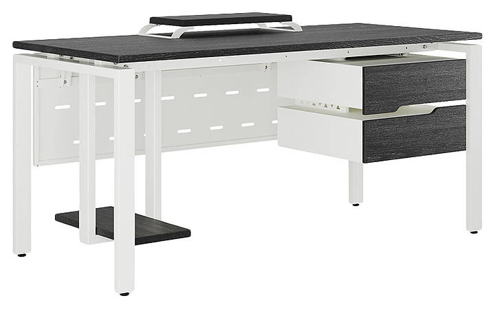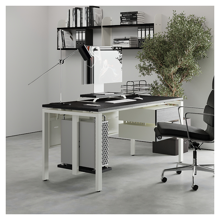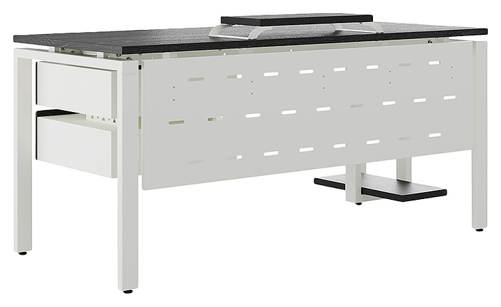 Офисный стол Кобор P-120/60 white/glazed используется в офисных помещениях и кабинетах руководителей. Модель оснащена П-образными опорами. Каркас выполнен из металла, выкрашенного в цвет белый муар (RAL9016), столешница – из ламинированной древесно-стружечной плиты (ЛДСП) цвета черный дуб (H3178 ST37).