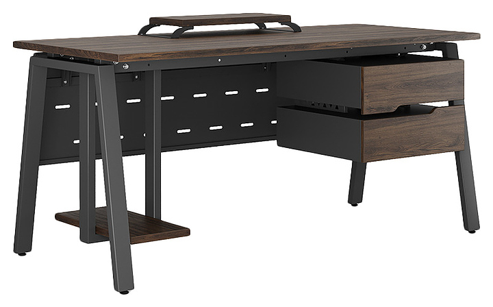 Офисный стол Кобор A-160/60 black/charlston используется в офисных помещениях и кабинетах руководителей. Модель оснащена A-образными опорами. Каркас выполнен из металла, выкрашенного в цвет черный муар (RAL9005), столешница – из ламинированной древесно-стружечной плиты (ЛДСП) цвета дуб чарльстон (H3154 ST36). Опции (заказываются отдельно):