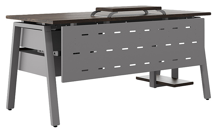 Офисный стол Кобор A-160/70 aluminum/charlston используется в офисных помещениях и кабинетах руководителей. Модель оснащена A-образными опорами. Каркас выполнен из металла, выкрашенного в цвет алюминиевый металлик (RAL9006), столешница – из ламинированной древесно-стружечной плиты (ЛДСП) цвета дуб чарльстон (H3154 ST36). Опции (заказываются отдельно):