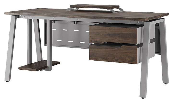 Офисный стол Кобор A-120/80 aluminum/charlston используется в офисных помещениях и кабинетах руководителей. Модель оснащена A-образными опорами. Каркас выполнен из металла, выкрашенного в цвет алюминиевый металлик (RAL9006), столешница – из ламинированной древесно-стружечной плиты (ЛДСП) цвета дуб чарльстон (H3154 ST36). Опции (заказываются отдельно):