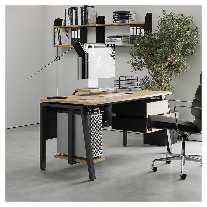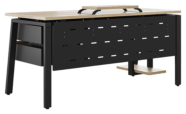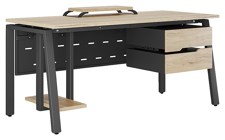 Офисный стол Кобор AB-180/70 black/natural используется в офисных помещениях и кабинетах руководителей. Модель оснащена A-образными опорами со скошенными фронтальными сегментами. Каркас выполнен из металла, выкрашенного в цвет черный муар (RAL9005), столешница – из ламинированной древесно-стружечной плиты (ЛДСП) цвета натуральный дуб (H1180 ST37). Опции (заказываются отдельно):