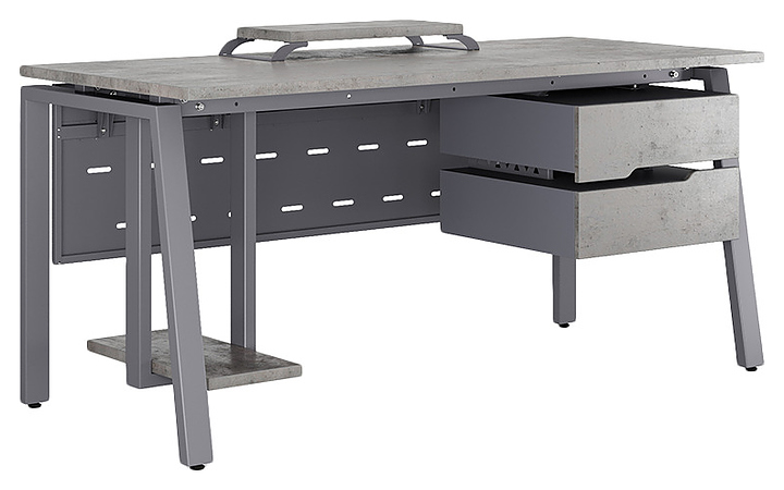 Офисный стол Кобор AB-80/60 graphite/chicago используется в офисных помещениях и кабинетах руководителей. Модель оснащена A-образными опорами со скошенными фронтальными сегментами. Каркас выполнен из металла, выкрашенного в цвет графит муар (RAL7024), столешница – из ламинированной древесно-стружечной плиты (ЛДСП) цвета бетон чикаго (F186 ST9). Опции (заказываются отдельно):