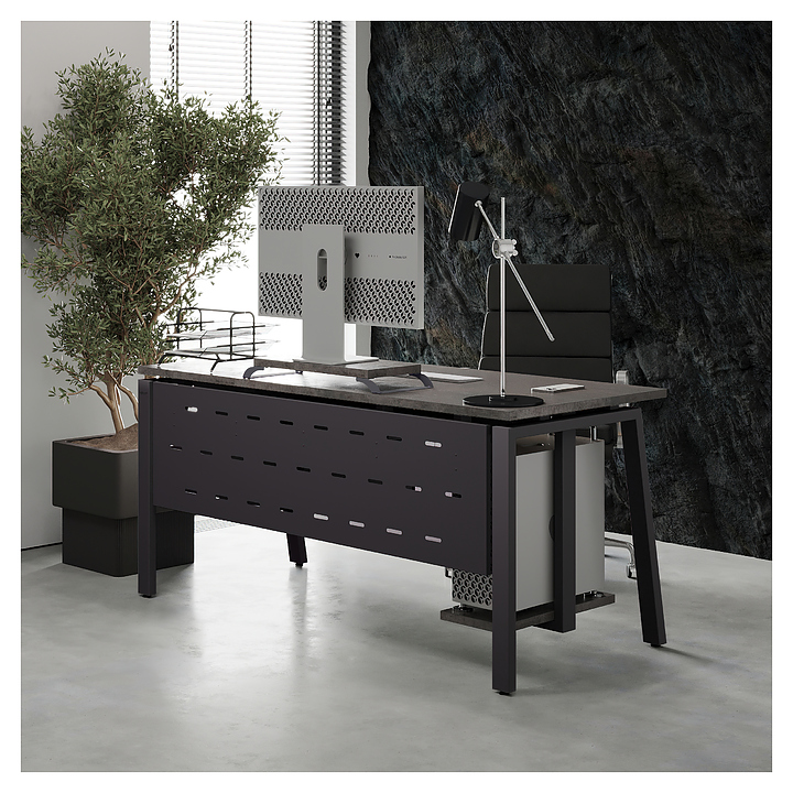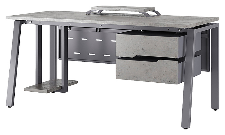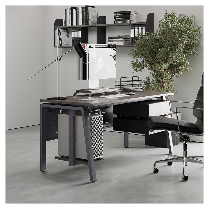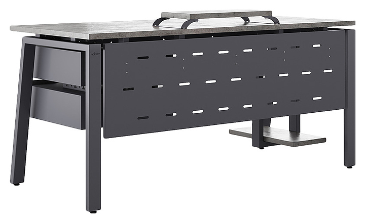 Офисный стол Кобор AB-160/60 graphite/chicago используется в офисных помещениях и кабинетах руководителей. Модель оснащена A-образными опорами со скошенными фронтальными сегментами. Каркас выполнен из металла, выкрашенного в цвет графит муар (RAL7024), столешница – из ламинированной древесно-стружечной плиты (ЛДСП) цвета бетон чикаго (F186 ST9). Опции (заказываются отдельно):