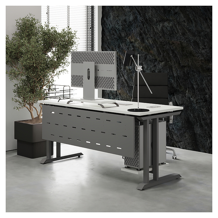 Офисный стол Кобор L1-100/70 aluminum/premium используется в офисных помещениях и кабинетах руководителей. Модель оснащена L-образными опорами. Каркас выполнен из металла, выкрашенного в цвет алюминиевый металлик (RAL9006), столешница – из ламинированной древесно-стружечной плиты (ЛДСП) цвета белый премиум (W1000 ST9). Опции (заказываются отдельно):