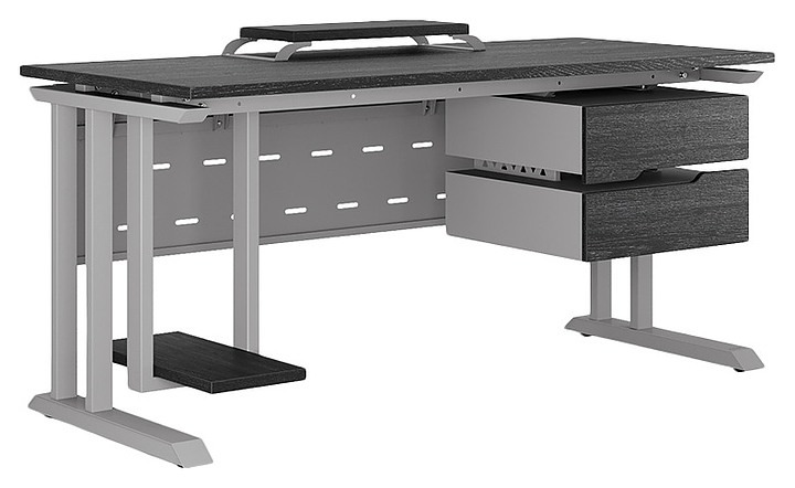 Офисный стол Кобор L1-80/60 aluminum/glazed используется в офисных помещениях и кабинетах руководителей. Модель оснащена L-образными опорами. Каркас выполнен из металла, выкрашенного в цвет алюминиевый металлик (RAL9006), столешница – из ламинированной древесно-стружечной плиты (ЛДСП) цвета черный дуб (H3178 ST37). Опции (заказываются отдельно):