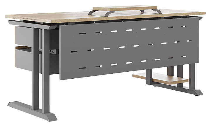 Офисный стол Кобор L1-180/70 aluminum/natural используется в офисных помещениях и кабинетах руководителей. Модель оснащена L-образными опорами. Каркас выполнен из металла, выкрашенного в цвет алюминиевый металлик (RAL9006), столешница – из ламинированной древесно-стружечной плиты (ЛДСП) цвета натуральный дуб (H1180 ST37). Опции (заказываются отдельно):