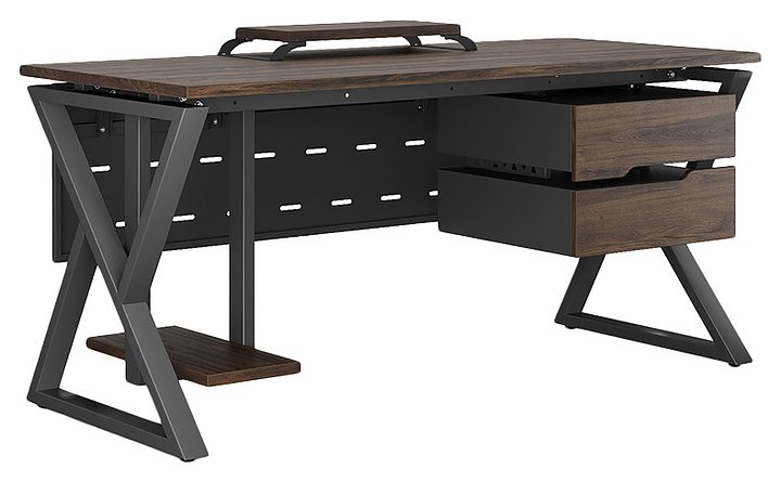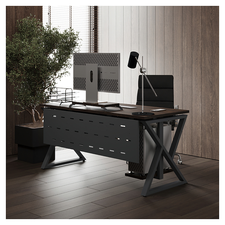 Офисный стол Кобор W-160/80 black/charlston используется в офисных помещениях и кабинетах руководителей. Модель оснащена W-образными опорами. Каркас выполнен из металла, выкрашенного в цвет черный муар (RAL9005), столешница – из ламинированной древесно-стружечной плиты (ЛДСП) цвета дуб чарльстон (H3154 ST36). Опции (заказываются отдельно):
