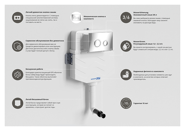 Бачок скрытого монтажа Wasserkraft Aller 10TLT.031.ME.CH01 предназначен для установки с навесными унитазами. Изделие выполнено из пластика, клавиша - из ABS-пластика. Коплектация: