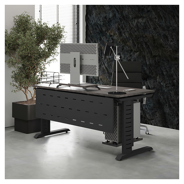 Офисный стол Кобор L2-180/70 black/chicago используется в офисных помещениях и кабинетах руководителей. Модель оснащена L-образными опорами с декоративной вставкой на боковинах. Каркас выполнен из металла, выкрашенного в цвет черный муар (RAL9005), столешница – из ламинированной древесно-стружечной плиты (ЛДСП) цвета бетон чикаго (F186 ST9). Опции (заказываются отдельно):