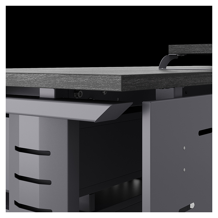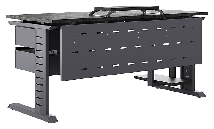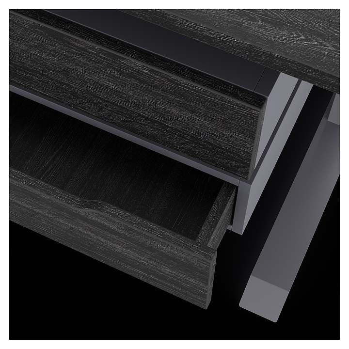 Офисный стол Кобор L2-80/80 graphite/glazed используется в офисных помещениях и кабинетах руководителей. Модель оснащена L-образными опорами с декоративными вставками на боковинах. Каркас выполнен из металла, выкрашенного в цвет графит муар (RAL7024), столешница – из ламинированной древесно-стружечной плиты (ЛДСП) цвета черный дуб (H3178 ST37). Опции (заказываются отдельно):