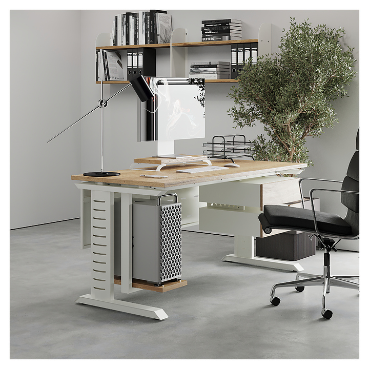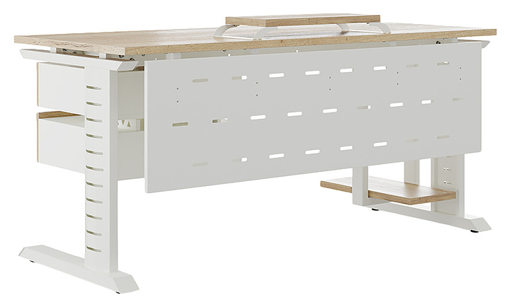 Офисный стол Кобор L2-100/80 white/natural используется в офисных помещениях и кабинетах руководителей. Модель оснащена L-образными опорами с декоративными вставками на боковинах. Каркас выполнен из металла, выкрашенного в цвет белый муар (RAL9016), столешница – из ламинированной древесно-стружечной плиты (ЛДСП) цвета натуральный дуб (H1180 ST37). Опции (заказываются отдельно):