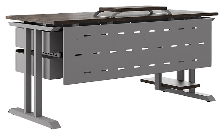 Офисный стол Кобор T-160/60 aluminum/charlston используется в офисных помещениях и кабинетах руководителей. Модель оснащена T-образными опорами. Каркас выполнен из металла, выкрашенного в цвет алюминиевый металлик (RAL9006), столешница – из ламинированной древесно-стружечной плиты (ЛДСП) цвета дуб чарльстон (H3154 ST36). Опции (заказываются отдельно):