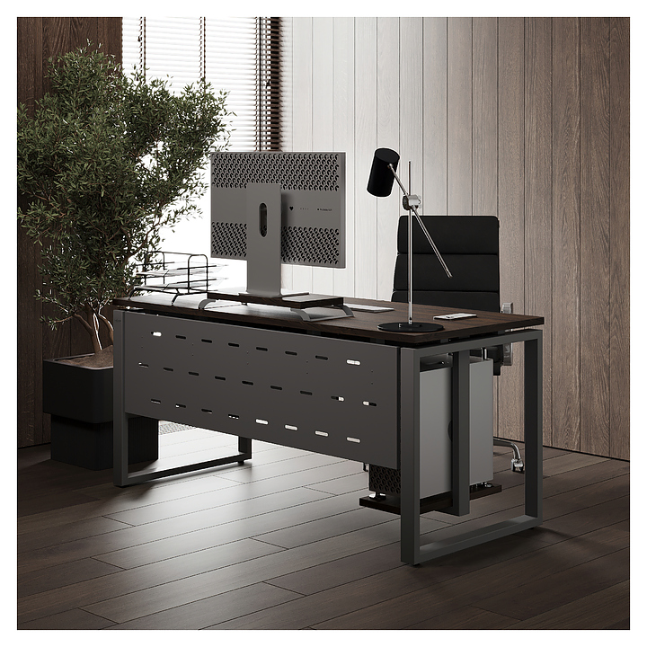 Офисный стол Кобор O1-160/80 aluminum/charlston используется в офисных помещениях и кабинетах руководителей. Модель оснащена O-образными опорами. Каркас выполнен из металла, выкрашенного в цвет алюминиевый металлик (RAL9006), столешница – из ламинированной древесно-стружечной плиты (ЛДСП) цвета дуб чарльстон (H3154 ST36). Опции (заказываются отдельно):