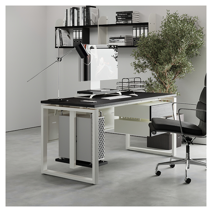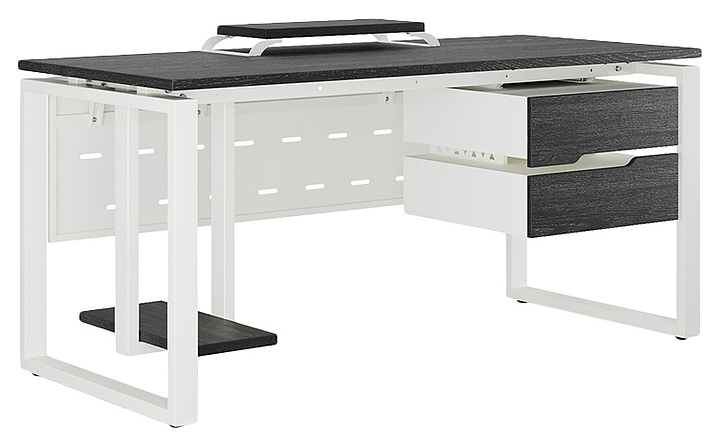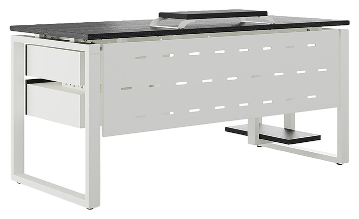 Офисный стол Кобор O1-120/60 white/glazed используется в офисных помещениях и кабинетах руководителей. Модель оснащена O-образными опорами. Каркас выполнен из металла, выкрашенного в цвет белый муар (RAL9016), столешница – из ламинированной древесно-стружечной плиты (ЛДСП) цвета черный дуб (H3178 ST37). Опции (заказываются отдельно):