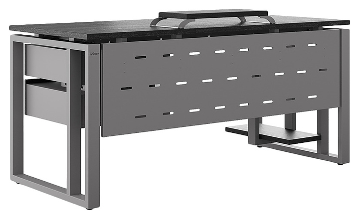 Офисный стол Кобор O2-120/60 aluminum/glazed используется в офисных помещениях и кабинетах руководителей. Модель оснащена усиленными вертикальной балкой O-образными опорами. Каркас выполнен из металла, выкрашенного в цвет алюминиевый металлик (RAL9006), столешница – из ламинированной древесно-стружечной плиты (ЛДСП) цвета черный дуб (H3178 ST37). Опции (заказываются отдельно):