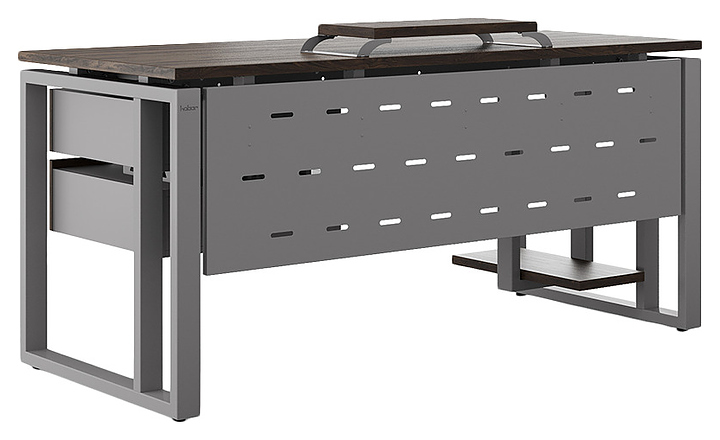 Офисный стол Кобор O2-100/60 aluminum/charlston используется в офисных помещениях и кабинетах руководителей. Модель оснащена усиленными вертикальной балкой O-образными опорами. Каркас выполнен из металла, выкрашенного в цвет алюминиевый металлик (RAL9006), столешница – из ламинированной древесно-стружечной плиты (ЛДСП) цвета дуб чарльстон (H3154 ST36). Опции (заказываются отдельно):