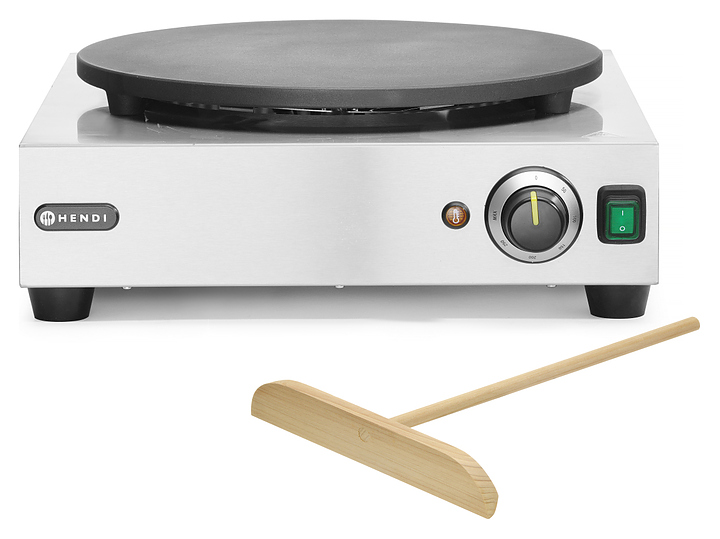 Блинница HENDI 212028 используется на предприятиях общественного питания и торговли для выпекания блинов. Модель оснащена устойчивыми нескользящими опорами и электромеханической панелью управления. Корпус выполнен из нержавеющей стали, жарочная поверхность – из чугуна с керамическим покрытием. В комплект поставки входит деревянная лопатка. Особенности:
