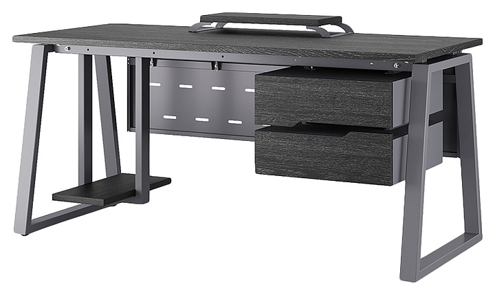 Офисный стол Кобор TR-80/70 graphite/glazed используется в офисных помещениях и кабинетах руководителей. Модель оснащена опорами в форме трапеции. Каркас выполнен из металла, выкрашенного в цвет графит муар (RAL7024), столешница – из ламинированной древесно-стружечной плиты (ЛДСП) цвета черный дуб (H3178 ST37). Опции (заказываются отдельно):