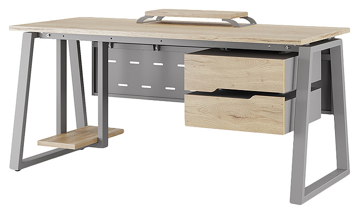 Офисный стол Кобор TR-100/60 aluminum/natural используется в офисных помещениях и кабинетах руководителей. Модель оснащена опорами в форме трапеции. Каркас выполнен из металла, выкрашенного в цвет алюминиевый металлик (RAL9006), столешница – из ламинированной древесно-стружечной плиты (ЛДСП) цвета натуральный дуб (H1180 ST37). Опции (заказываются отдельно):