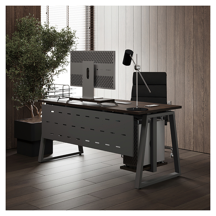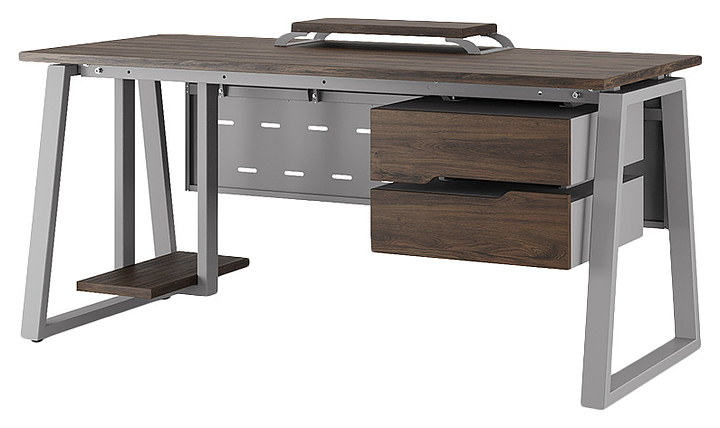 Офисный стол Кобор TR-120/60 aluminum/charlston используется в офисных помещениях и кабинетах руководителей. Модель оснащена опорами в форме трапеции. Каркас выполнен из металла, выкрашенного в цвет алюминиевый металлик (RAL9006), столешница – из ламинированной древесно-стружечной плиты (ЛДСП) цвета дуб чарльстон (H3154 ST36). Опции (заказываются отдельно):