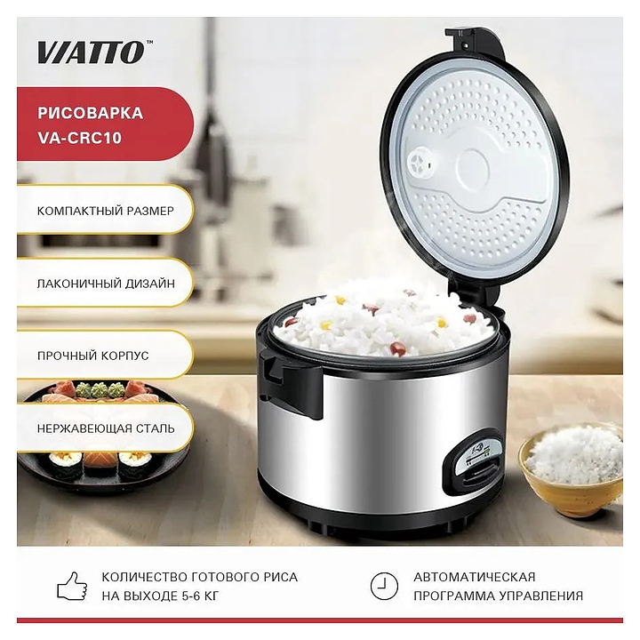 Рисоварка VIATTO VA-CRC10 используется в кафе, суши-барах, ресторанах восточной кухни, на предприятиях общественного питания и торговли для варки и поддержания в теплом состоянии риса и других круп. Модель оснащена ручками из термоизоляционного материала, позволяющего избежать ожогов. Корпус выполнен из нержавеющей стали, чаша - из алюминиевого сплава с антипригарным покрытием. Особенности: