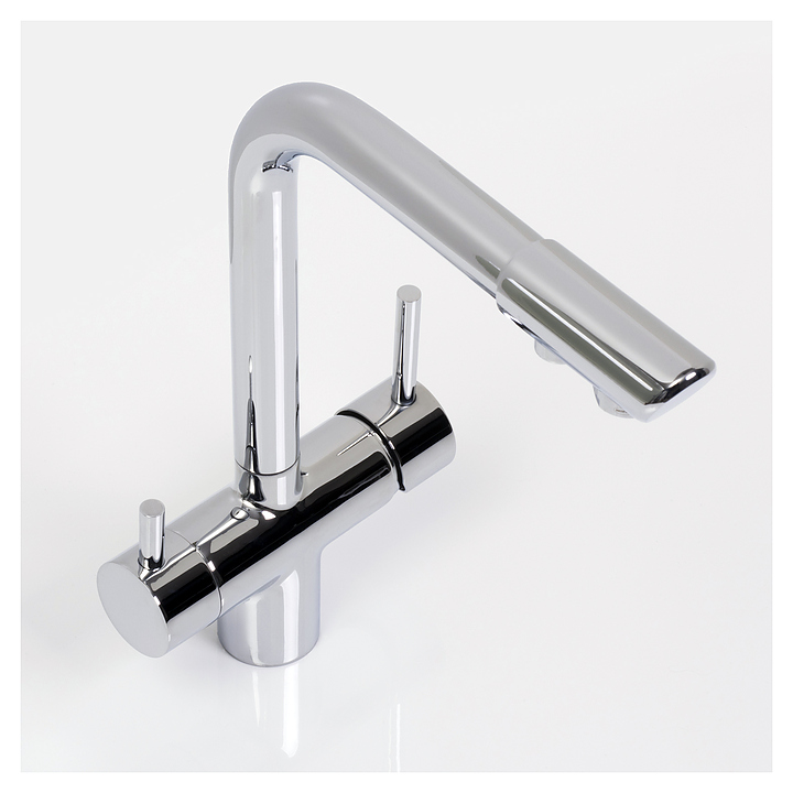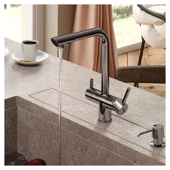 Смеситель Wasserkraft A8317 предназначен для использования в кухонных помещениях для подачи горячей и холодной воды. Модель оснащена совмещенным изливом для проточной и фильтрованной воды, керамическим картриджем, обеспечивающим плавный ход рычага смесителя, контроль и точность при выборе напора и температуры воды, а также аэратором для создания мягкой ровной струи без разбрызгивания. Изделие выполнено из латуни, отличающейся прочностью, долговечностью и устойчивостью к перепадам температур. В комплект поставки входят гибкая подводка, пластиковый уплотнитель для монтажа и набор для монтажа. Особенности: