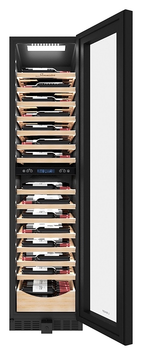 Винный шкаф Libhof Sommelier SMD-105 Black предназначен для хранения при оптимальных условиях бутилированного вина различных сортов в барах, ресторанах, специализированных магазинах, подсобных складских помещениях, а также в домашних условиях. Модель оснащена холодильной камерой с 2 независимыми температурными зонами, запираемой на ключ распашной дверью на скрытых внутренних петлях, длинной вертикальной рукояткой, прозрачным обзорным стеклом, внутренней сенсорной панелью управления и цифровым дисплеем с синей подсветкой индикации. Корпус выполнен из металла с антикоррозийным покрытием черного цвета и полным остеклением фронта двери, полки и ящик – из массива буковой древесины. В комплект поставки входят 14 полок с направляющими и ящик для бутылок, крепеж для рукоятки, 2 ключа от дверного замка и инструкция по эксплуатации. Особенности: