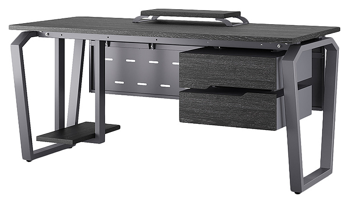 Офисный стол Кобор TB-160/60 graphite/glazed используется в офисных помещениях и кабинетах руководителей. Модель оснащена опорами в форме обратной трапеции со скошенными верхними углами. Каркас выполнен из металла, выкрашенного в цвет графит муар (RAL7024), столешница – из ламинированной древесно-стружечной плиты (ЛДСП) цвета черный дуб (H3178 ST37). Опции (заказываются отдельно):