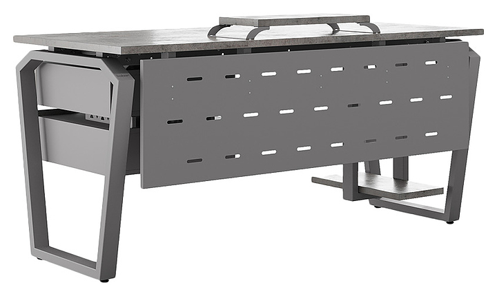 Офисный стол Кобор TB-160/60 aluminum/chicago используется в офисных помещениях и кабинетах руководителей. Модель оснащена опорами в форме обратной трапеции со скошенными верхними углами. Каркас выполнен из металла, выкрашенного в цвет алюминиевый металлик (RAL9006), столешница – из ламинированной древесно-стружечной плиты (ЛДСП) цвета бетон чикаго (F186 ST9). Опции (заказываются отдельно):