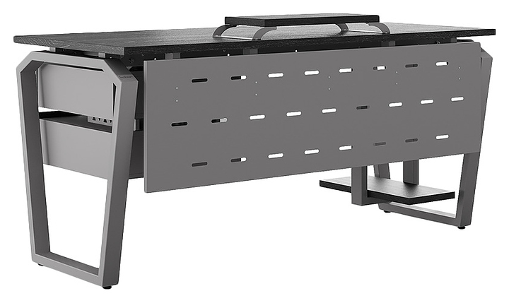 Офисный стол Кобор TB-100/60 aluminum/glazed используется в офисных помещениях и кабинетах руководителей. Модель оснащена опорами в форме обратной трапеции со скошенными верхними углами. Каркас выполнен из металла, выкрашенного в цвет алюминиевый металлик (RAL9006), столешница – из ламинированной древесно-стружечной плиты (ЛДСП) цвета черный дуб (H3178 ST37). Опции (заказываются отдельно):