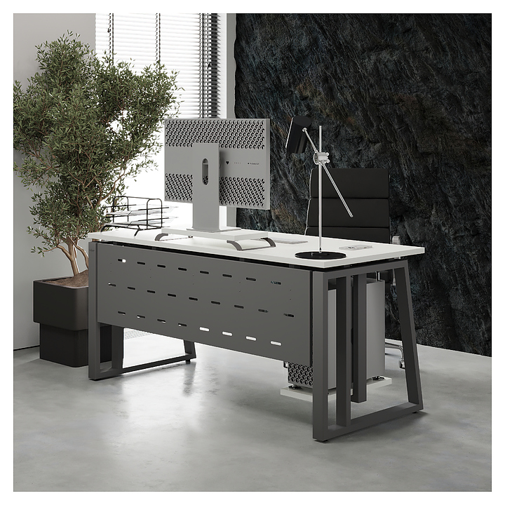 Офисный стол Кобор TS2-140/80 aluminum/premium используется в офисных помещениях и кабинетах руководителей. Модель оснащена усиленными вертикальными балками опорами в форме наклонной трапеции. Каркас выполнен из металла, выкрашенного в цвет алюминиевый металлик (RAL9006), столешница – из ламинированной древесно-стружечной плиты (ЛДСП) цвета белый премиум (W1000 ST9). Опции (заказываются отдельно):